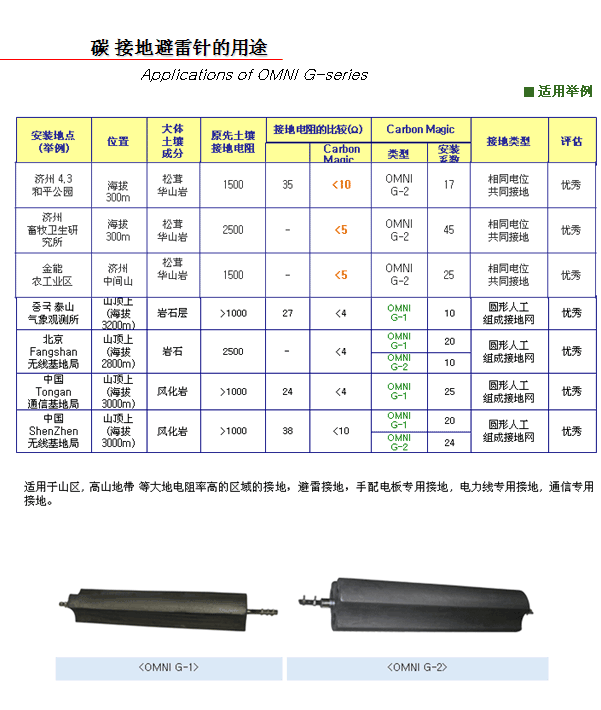 “Carbon Ground Magic”低电阻碳接地模块是以现有的特殊碳材料组成、而且比同等尺寸的金属材料,能用十几倍的单位面积扩大效果和异常电流分析效果,增强雷电流的释放,因电解层拥有强有力的除湿能力和维持湿度能力,很大程度上减少接地本身和土壤之间的接触电阻。